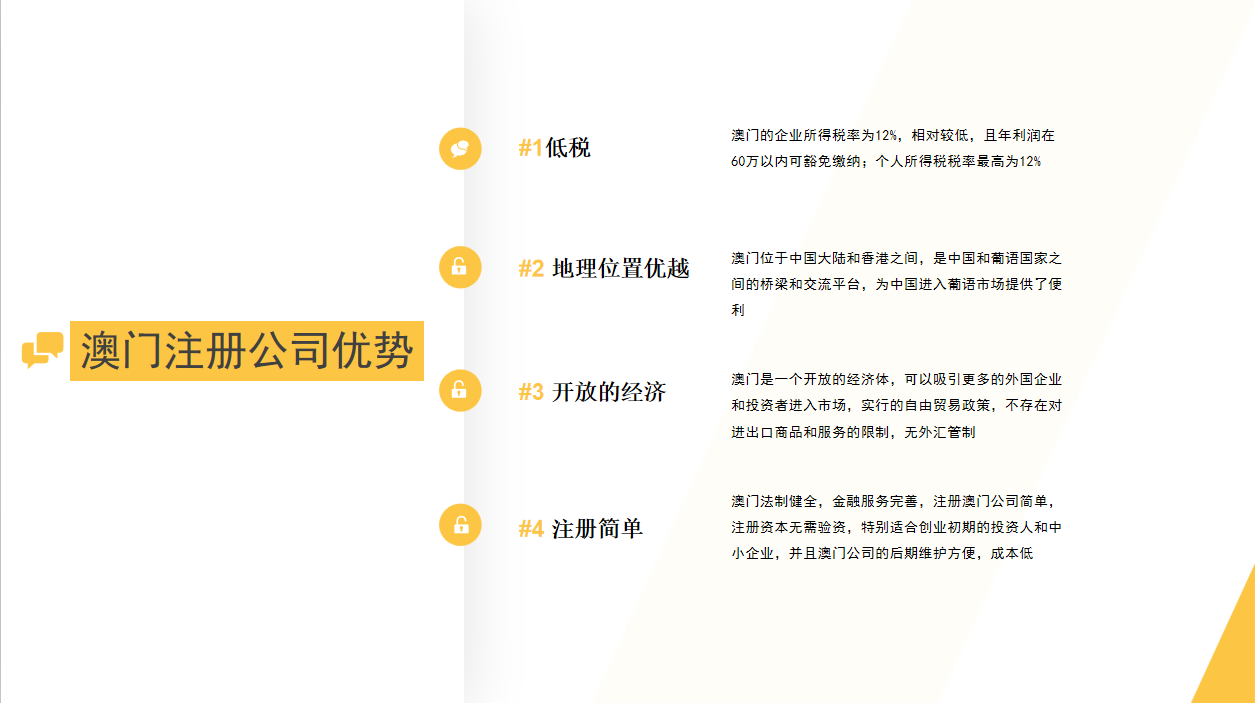 1.低稅 :澳門的企業(yè)所得稅率為12%,相對(duì)較低,且年利潤(rùn)在60萬(wàn)以內(nèi)可豁免繳納;個(gè)人所得稅稅率最高為12%