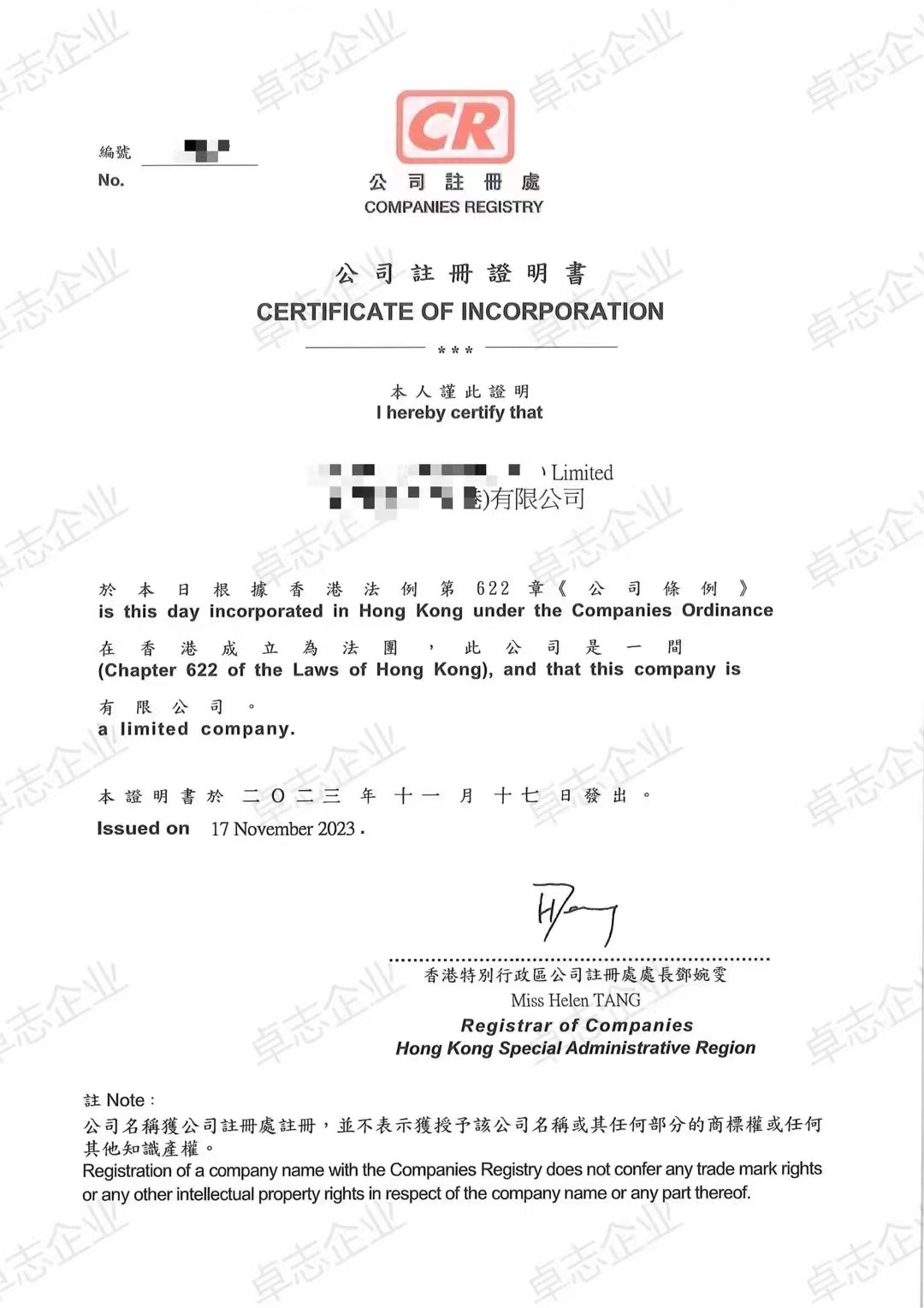 英文名稱必須以“Limited”結(jié)尾,中文名稱必須以“有限公司”結(jié)尾