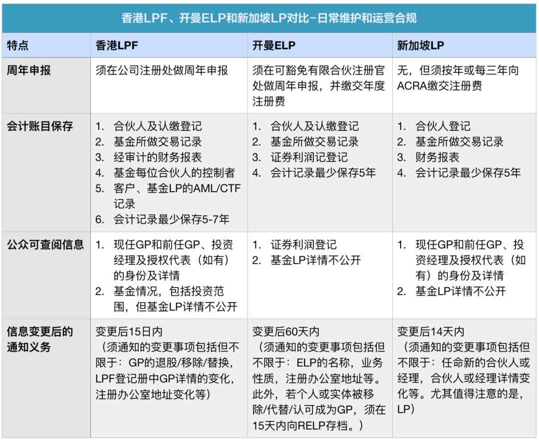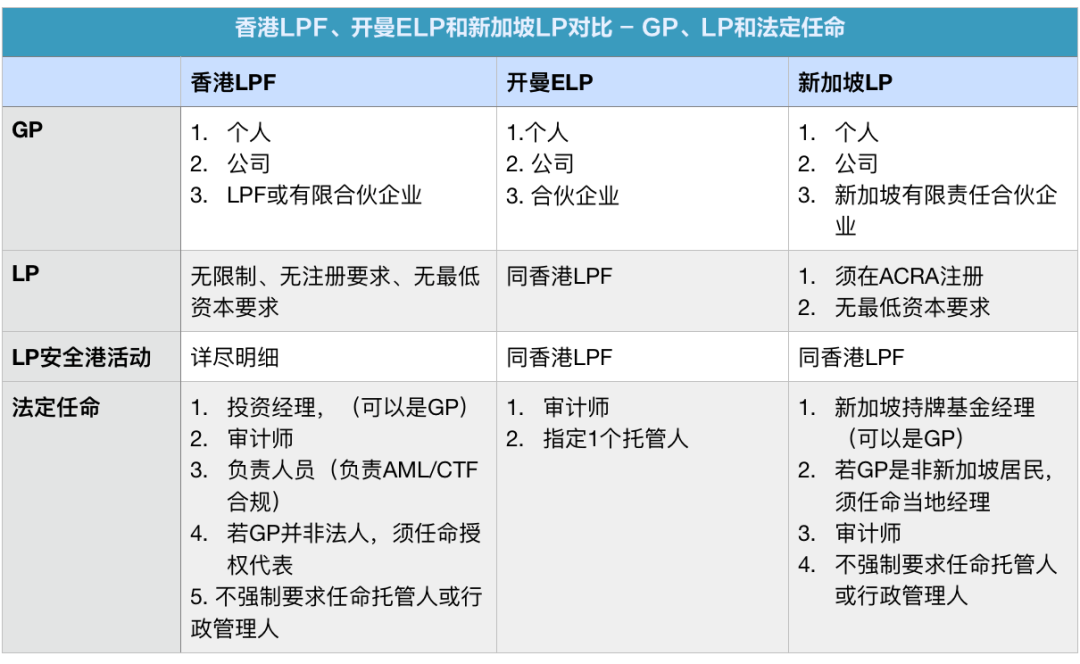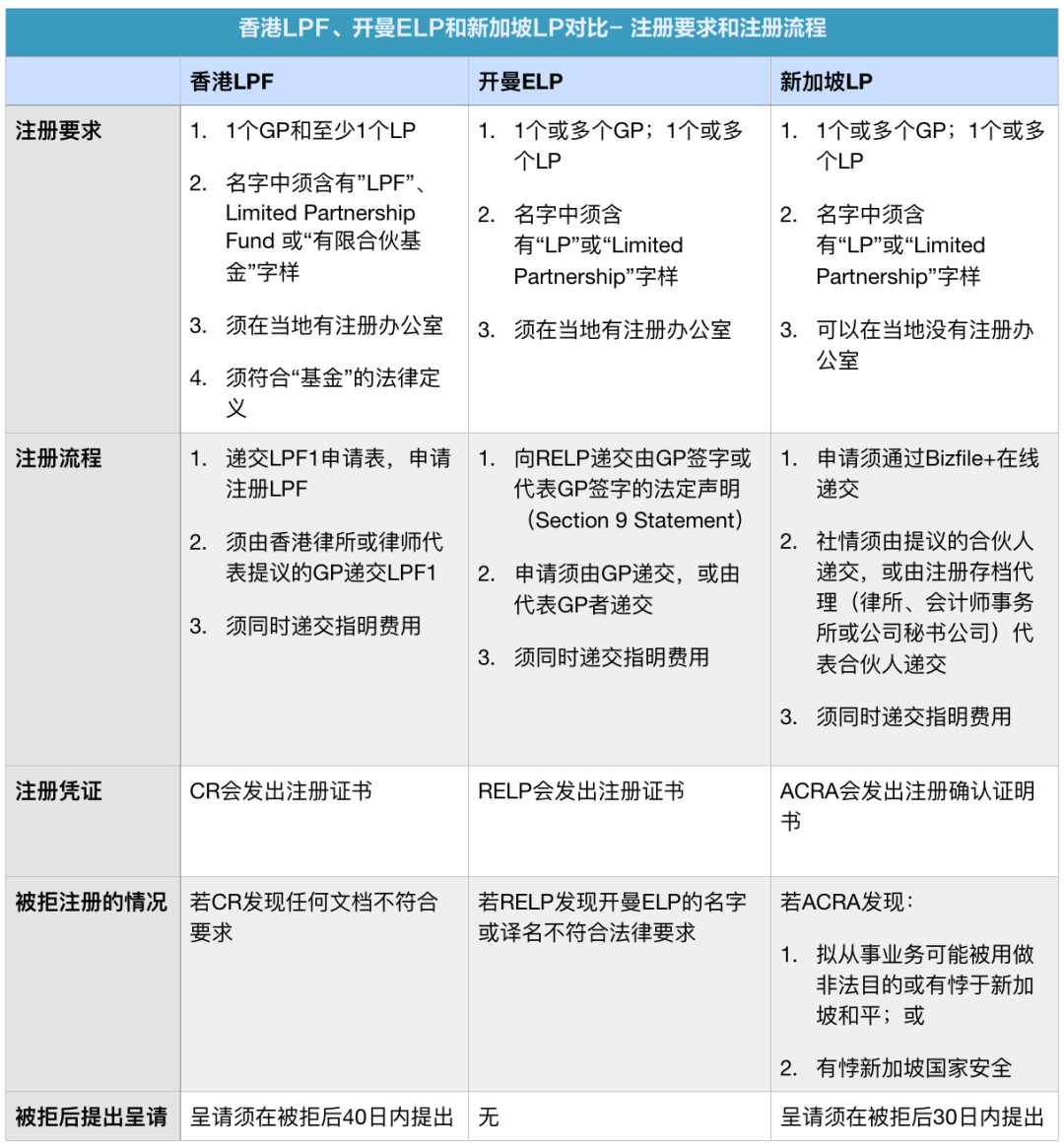1、對比一: 規(guī)范法例與主管機(jī)構(gòu) 香港、開曼和新加坡,都制定了與基金相關(guān)的法例;主管機(jī)構(gòu)分別是香港公司注冊處(Companies Registry,CR)、開曼群島可豁免有限合伙注冊官(Cayman Islands Registrar of Exempted Limited Partnerships ,RELP)和新加坡(Accounting and Corporate Regulatory Authority,ACRA)。 從法律性質(zhì)上看,無論是香港LPF、開曼ELP還是新加坡LP,都是非法人實(shí)體,須由GP對基金進(jìn)行管理,而LP則以其出資額為限承擔(dān)有限責(zé)任,并享受相應(yīng)的收益分配。 至于投資領(lǐng)域,三個(gè)司法管轄區(qū)均無限制。但是,如果從事需持牌受規(guī)管領(lǐng)域,仍需要滿足相關(guān)持牌義務(wù),須視情況而定。 注冊要求和注冊流程 在基金注冊方面,三個(gè)司法管轄區(qū)也是大同小異。針對LP,都要求至少有1個(gè)LP;但是,在GP方面,香港LPF要求是1個(gè)GP,而開曼ELP和新加坡LP則允許有1個(gè)或多個(gè)GP。 據(jù)我們了解,在基金的實(shí)際操作中多個(gè)GP并存的情況并不常見,畢竟這容易帶來“政出多門、效率低下”的問題。通常,基金都會(huì)只選擇只有一個(gè)GP,由其全權(quán)進(jìn)行運(yùn)營管理。 值得注意的是,香港LPF和開曼ELP都需要在當(dāng)?shù)赜凶赞k公室(Register Office),但新加坡LP無此要求。