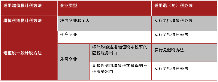 118號文同時明確了提供增值稅零稅率應稅服務的企業(yè)增值稅退(免)稅方法的適用??傮w原則與現行106號文的規(guī)定一致。詳見附表。