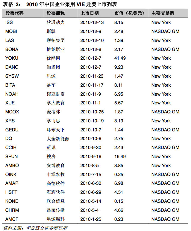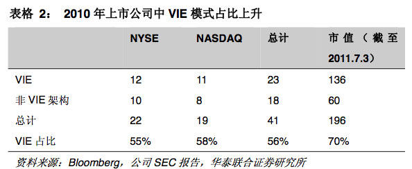 近期數(shù)據(jù)表明, VIE 架構(gòu)的使用有逐步加強(qiáng)的趨勢。2010 年 22 家主板上市企業(yè)中12 家使用 VIE 架構(gòu),19 家納斯達(dá)克上市企業(yè)中 11 家使用 VIE 架構(gòu),其中包括當(dāng)當(dāng)、博納影業(yè)、優(yōu)酷、麥考林等知名企業(yè),占比高達(dá) 55%和 58%。從市值角度看,VIE架構(gòu)企業(yè)更勝一籌,以 2011 年 7 月 3 日收盤價(jià)計(jì),實(shí)行 VIE 架構(gòu)的企業(yè)總市值占比達(dá) 70%(表 2、表 3)。