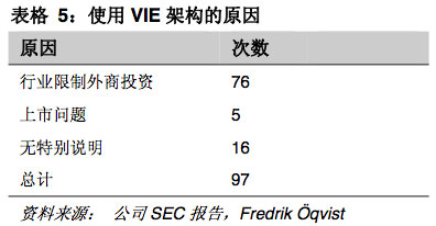 上市公司所處的行業(yè)看,使用 VIE 架構(gòu)最多的是在國家對外商投資有嚴(yán)格限制的領(lǐng)域,從最早的互聯(lián)網(wǎng)復(fù)制到后來的教育、金融服務(wù)和房地產(chǎn)。在上市文件中,大多數(shù)公司將國家對外商投資特定領(lǐng)域 的限制列為公司使用 VIE 結(jié)構(gòu)的主要原因,其次是政府對企業(yè)赴海外上市的規(guī)定。這些數(shù)據(jù)驗(yàn)證了我們之前的判斷,VIE 已經(jīng)成為中國企業(yè)規(guī)避海外上市限制的主要手段。