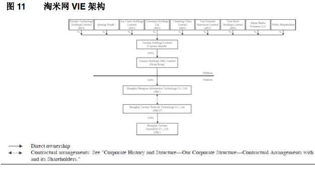 不過,需要指出的是,上述兩項(xiàng)通知目前尚未對 VIE 架構(gòu)構(gòu)成實(shí)質(zhì)性威脅。2011 年 6月,運(yùn)營兒童題材網(wǎng)游的淘米網(wǎng)登陸紐交所,使用的仍是 VIE 架構(gòu)(圖 11)。其法律顧問北京金杜律師事務(wù)所出具報(bào)告認(rèn)為,淘米網(wǎng)的 VIE 架構(gòu)于 2009 年 6 月簽署,早于新聞出版總署的通知,故不存在違背事項(xiàng)。同時(shí),金杜認(rèn)為,鑒于當(dāng)前多頭監(jiān)管模式,新聞出版總署不太可能單方面對 VIE 架構(gòu)產(chǎn)生實(shí)際影響,根據(jù)相關(guān)法律,新聞出版總署僅負(fù)責(zé)網(wǎng)游上線前審批,而文化部負(fù)責(zé)監(jiān)管所有網(wǎng)游產(chǎn)業(yè),且如有網(wǎng)游未經(jīng)新聞出版總署批準(zhǔn)而上線的,其監(jiān)管和 調(diào)查權(quán)歸文化部。此例說明,盡管有通知出臺(tái),但仍有變通之策。