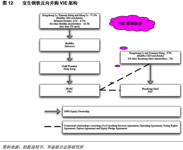 2010 年 4 月,寶生鋼鐵以換股方式收購了一家香港公司。該香港公司在中國大陸擁有一家附屬子公司(WOFE),子公司通過VIE協(xié)議,控制了該公司和河北的一個(gè)冷軋 機(jī)鋼鐵公司的全部經(jīng)濟(jì)收益。這種做法與先前互聯(lián)網(wǎng)公司上市的制度安排沒有區(qū)別,并且已經(jīng)很普遍。這種安排通常不需要通過政府特別批準(zhǔn),但不同的是,這一次 河北地方政府指出:“該協(xié)議違背了中國現(xiàn)行的有關(guān)外商投資企業(yè)的管理政策和國家法規(guī)?!弊源?寶生公司不得不中止與河北鋼鐵公司的 VIE 協(xié)議,并放棄在美國市場進(jìn)行融資(圖 12)。