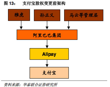 在協(xié)議控制結(jié)構(gòu)下,支付寶從阿里巴巴集團(tuán)旗下全資子公司 Alipay,轉(zhuǎn)至馬云和謝世煌全資擁有的浙江阿里巴巴電子商務(wù)有限公司(下稱浙江阿里巴巴)。工商資料顯示,轉(zhuǎn)讓分兩次進(jìn)行,一次在 2009 年 6 月 1 日,另一次發(fā)生在 2010 年 8 月 6 日,兩次轉(zhuǎn)讓的總價(jià)約為 3.3 億元。矛盾發(fā)生在股權(quán)轉(zhuǎn)讓之后。2011 年一季度,馬云以協(xié)議控制不能獲取第三方支付牌照及危害國家經(jīng)濟(jì)安全為由,在股東反對、董事會(huì)未通過的情況下,單方面決定斷掉支付寶與阿里巴巴集團(tuán)之間的 協(xié)議控制關(guān)系(圖 13、圖 14)。