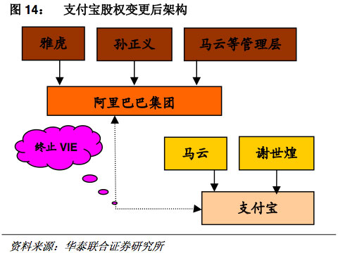支 付寶事件頗具戲劇性。據(jù)財(cái)新《新世紀(jì)》報(bào)道,2009 年 7 月 24 日,阿里巴巴董事會(huì)授權(quán)管理層通過進(jìn)行股權(quán)結(jié)構(gòu)調(diào)整來合法獲取支付牌照,但授權(quán)以協(xié)議控制為前提,即調(diào)整股權(quán)后成立的支付寶內(nèi)資公司只是持牌公司,與支付 寶有關(guān)的實(shí)際收入、利潤、技術(shù)和知識(shí)產(chǎn)權(quán)等,將通過一系列協(xié)議安排再轉(zhuǎn)移至阿里巴巴集團(tuán)。因此,阿里巴巴集團(tuán)可以合并支付寶的報(bào)表,而雅虎可合并阿里巴巴 集團(tuán)的報(bào)表。