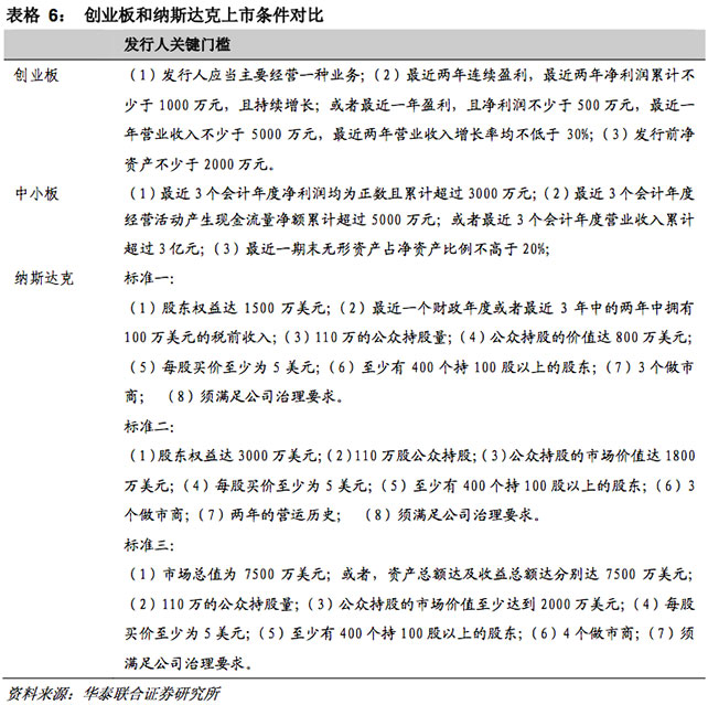 四波上市潮中,幾乎 清一色地選擇美國為上市地,而鮮有企業(yè)在國內(nèi)掛牌,這一狀況即便在國內(nèi)創(chuàng)業(yè)板出臺(tái)之后也未見改觀。究其原因,市場普遍認(rèn)為國內(nèi)創(chuàng)業(yè)板和中小板設(shè)置了過高的 財(cái)務(wù)門檻,將大批企業(yè)擋在大門之外。如創(chuàng)業(yè)板要求“最近兩年連續(xù)盈利,最近兩年凈利潤累計(jì)不少于 1000 萬元,且持續(xù)增長;或者最近一年盈利,且凈利潤不少于 500 萬元,最近一年?duì)I業(yè)收入不少于 5000 萬元”,中小板要求“最近 3個(gè)會(huì)計(jì)年度凈利潤均為正數(shù)且累計(jì)超過 3000 萬元”,相比之下,美國納斯達(dá)克的門檻較低,很適合尚未盈利但空間巨大的企業(yè)去實(shí)現(xiàn)“美國夢”(表 6)。