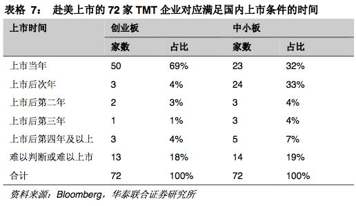 事實(shí)上,我們選取的 72 家赴美上市的 TMT 企業(yè),從其歷年盈利變化情況來看,超過八成企業(yè)滿足國內(nèi)創(chuàng)業(yè)板和中小板的盈利要求,只是上市的時(shí)間有所延后(表 7)。統(tǒng)計(jì)數(shù)據(jù)顯示:有 50 家企業(yè)赴美上市當(dāng)年就滿足創(chuàng)業(yè)板的條件,23 家滿足中小板的條件,占比分別為 69%和 32%;上市后次年滿足創(chuàng)業(yè)板和中小板的家屬分別為 3 家和24 家,占比 4%和 33%;兩項(xiàng)合計(jì)分別占比 73%和 65%。可見,逾六成企業(yè)在赴美上市與國內(nèi)上市之間的時(shí)間差異并不大。當(dāng)然,有人會(huì)認(rèn)為赴美上市后企業(yè)的利潤增長得益于資金助推,但我們的觀點(diǎn)是,利潤增 長更多的動(dòng)力是來自整個(gè) TMT 領(lǐng)域從無到有、從小到大的行業(yè)性機(jī)會(huì)。