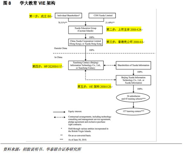 第一步:國內(nèi)個(gè)人股東設(shè)立 BVI 公司,一般而言,每個(gè)股東需要單獨(dú)設(shè)立 BVI 公司(之所選擇 BVI 公司,是因其具有注冊簡單、高度保密優(yōu)勢);第二步:以上述 BVI 公司、風(fēng)投為股東,設(shè)立開曼公司,作為上市主體;第三步:上市主體設(shè)立香港殼公司;第四步:香港殼公司在境內(nèi)設(shè)立外資全資子公司(WFOE);第五步:WFOE 與內(nèi)資公司簽訂一系列協(xié)議,達(dá)到利潤轉(zhuǎn)移及符合美國 VIE 會(huì)計(jì)準(zhǔn)則的標(biāo)準(zhǔn)。詳細(xì)步驟可以參考學(xué)大教育的 VIE 架構(gòu)情況(圖 8)。