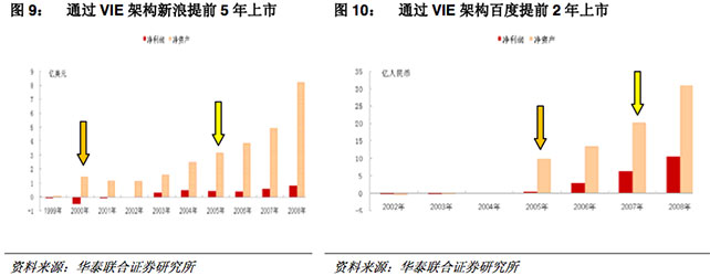 我 們以新浪和百度為例做簡要分析。新浪早在 2000 年就赴美上市,彼時(shí),國內(nèi)互聯(lián)網(wǎng)企業(yè)尚無上市先例,尋求海外突破是唯一選擇。而新浪上市前一年(1999 年),營收收入 283 萬美元、虧損 939 萬美元、凈資產(chǎn) 770 萬美元;上市當(dāng)年?duì)I收 1417 萬美元、虧損 5107 萬美元。這樣的財(cái)務(wù)狀況不僅達(dá)不到國內(nèi)上市的條件,更與海外直接IPO 要求差距甚遠(yuǎn)。如果為了滿足“四五六”要求,則新浪上市時(shí)點(diǎn)至少要延遲至 2005年。是年,新浪滿足“四五六”條款(圖 9)。
