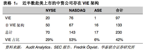 根據(jù) Fredrik 對赴美上市的中國公司的統(tǒng)計(jì),我們發(fā)現(xiàn)在 230 家赴美上市的公司中,接近半數(shù)(97 家)使用了 VIE 架構(gòu),而赴港上市企業(yè)中,也有 8 家使用了這種架構(gòu)。VIE 架構(gòu)在納斯達(dá)克上市的中國企業(yè)中尤為盛行,占比超過一半(53%),是創(chuàng)新型企業(yè)赴美上市的主要模式(表 1)。