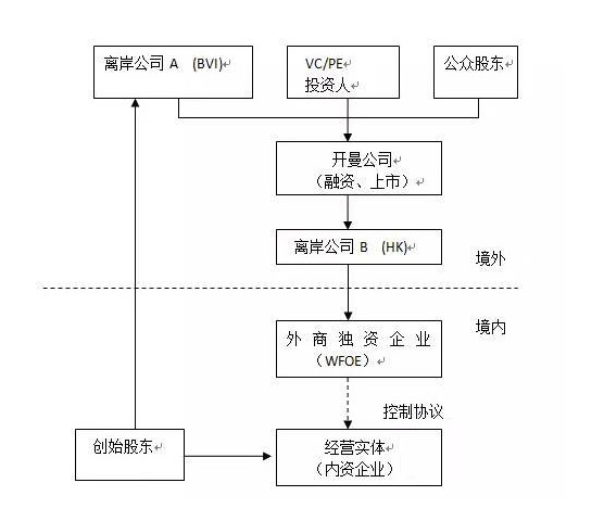 1.企業(yè)(指內(nèi)資經(jīng)營實(shí)體)的創(chuàng)始股東在境外設(shè)立一個(gè)離岸公司A,比如在英屬維爾京群島(BVI)或是開曼群島。