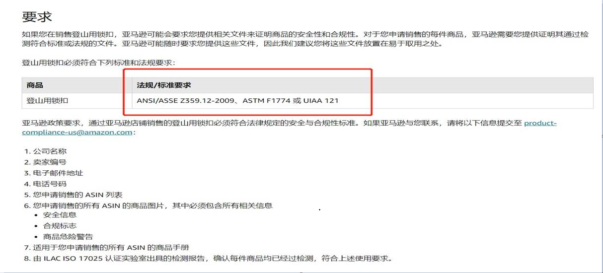 根據(jù)亞馬遜要求,所有攀巖產(chǎn)品(裝備)均應(yīng)經(jīng)過檢測,并且符合ANSI/ASSE Z359.12-2009、ASTM F1774 或 UIAA 121,其中一項即可。由ISO 17025 認證實驗室出具的檢測報告,確認每件商品均已經(jīng)過檢測,符合上述使用要求。(幺三幺2999五二0八 同V)