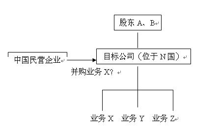 在此結(jié)構(gòu)中,中國(guó)民營(yíng)企業(yè)當(dāng)然可以以企業(yè)為股東在 N 國(guó)當(dāng)?shù)卦O(shè)立公司,來(lái)并購(gòu)業(yè)務(wù) X 。但在將來(lái),如果要對(duì)該當(dāng)?shù)毓具M(jìn)行任何運(yùn)作,均會(huì)涉及到中國(guó)及 N 國(guó)法律限制問題。同時(shí),目標(biāo)公司的兩個(gè)股東 A 鐘情于業(yè)務(wù) X ,仍希望進(jìn)行發(fā)展,而股東 B 則希望通過轉(zhuǎn)讓收取收益。如何實(shí)現(xiàn)呢?