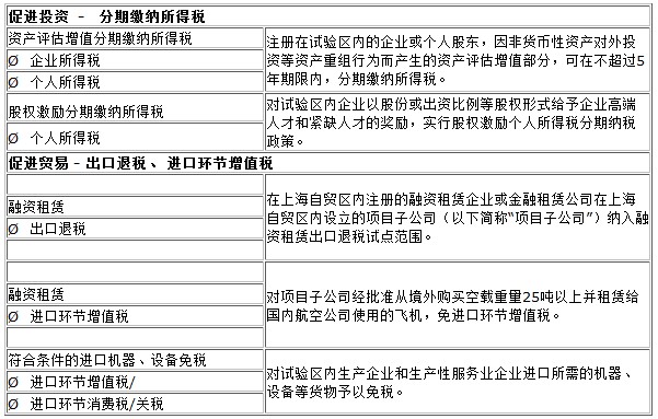 根據(jù)《總體方案》,上海自貿(mào)區(qū)將實(shí)施促進(jìn)投資和貿(mào)易的稅收政策,對涉及的所得稅(包括企業(yè)所得稅和個(gè)人所得稅)、進(jìn)口環(huán)節(jié)稅收、出口退稅采 取特殊的稅收政策。大致包括: