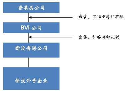新設(shè)香港公司的目的是為方便日后土地升值時(shí)出售。其中集團(tuán)曾經(jīng)考慮是否加插BVI公司以免除香港印花稅,即: