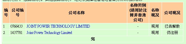 公司編號∶ 0766433第二條注冊號為1437781的Joint Power Technology Limited,目前還在用。
