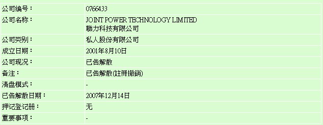 第一條注冊號為0766433 的JOINT POWER TECHNOLOGY LIMITED,上面顯示公司狀況已經(jīng)是解散了。