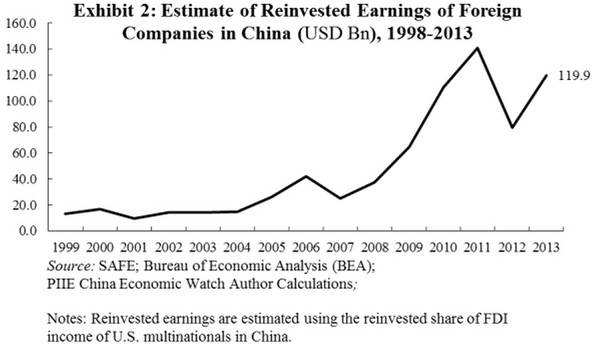 兩種數(shù)據(jù)中所出現(xiàn)的巨大的、并在逐漸增長的差距,大多是源于再投資收益。商務部并不登記那些不以資本投資的名義上報的再投資。在中國,外國公司和外國投資的收益在2013年可能會達到接近2180億美元?;谠谥袊拿绹鐕镜臄?shù)據(jù)來看,至少一半的收入將被再投資。作為對比,2013年外國公司上報的資本投資總共卻只有420億美元。從這可以看出,保守估計的話,再投資收益至少占SAFE和MOFCOM外商直接數(shù)據(jù)差額的60%。