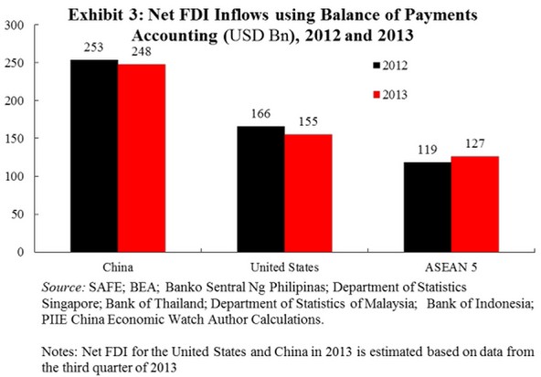 雖然SAFE數(shù)據(jù)更不頻繁,也更不細致,但它與其他國家更具可比性。因為,SAFE數(shù)據(jù)是基于國際標準來計算貿(mào)易支付差額的。根據(jù)SAFE的數(shù)據(jù),中國在2012年和2013年仍然是外國直接投資資本流入的首選國家。以中國資本流入的速度來看,中國仍正在FDI的存量上逐漸靠近歐盟和美國。要想趕上中國而成為FDI增長的首要目的地,東盟五國仍然還有很長的路要走。
