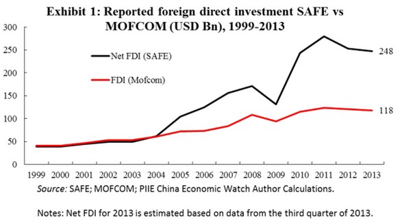中國在外商直接投資上發(fā)布了兩組數(shù)據(jù)。第一組是由商務部(MOFCOM)發(fā)布。商務部的數(shù)據(jù)顯示,2013年中國僅有1180億美元流入。第二組是由國家外匯管理局(SAFE)發(fā)布的。外管局的數(shù)據(jù)是前一組數(shù)據(jù)的兩倍。