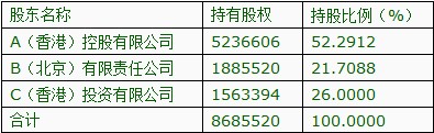 2009年8月8日,根據(jù)山東某制藥有限公司股東大會(huì)決議,A(香港)控股有限公司將其持有的山東某制藥有限公司1563394元人民幣股權(quán)(占注冊(cè)資本的26%)以33128333.34元的價(jià)格轉(zhuǎn)讓給C(香港)投資有限公司。股權(quán)轉(zhuǎn)讓后,山東某制藥有限公司股東持股情況見下表: