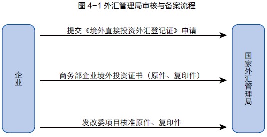 企業(yè)獲國家發(fā)改委和商務(wù)主管部門許可后憑有關(guān)文件向所在地國家外管局申請辦理境外投資外匯登記,之后直接到銀行辦理境外投資購付匯手續(xù)(圖4-1)。
