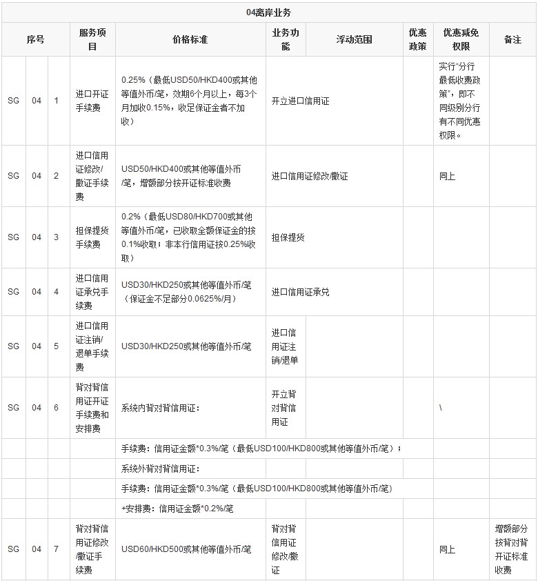 - 開立進(jìn)口信用證:0.25%(最低USD50/HKD400或其他等值外幣/筆,效期6個月以上,每3個月加收0.15%,收足保證金者不加收);