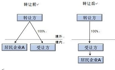 該情形下,非居民轉讓方將其直接持有的居民企業(yè)A的股權轉讓給其100%控股的非居民受讓方,并換取非居民受讓方的股權,即用原持有的居民企業(yè)股權增資受讓方,并使得該受讓方成為居民企業(yè)A的股東。