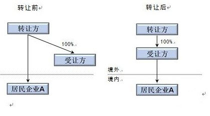 該情形下,非居民轉讓方將其直接持有的居民企業(yè)A的股權轉讓給其100%控股的境內受讓方(居民企業(yè)),并換取境內受讓方的股權,即用原持有的居民企業(yè)股權增資境內受讓方,并使得該境內受讓方成為居民企業(yè)A的股東。