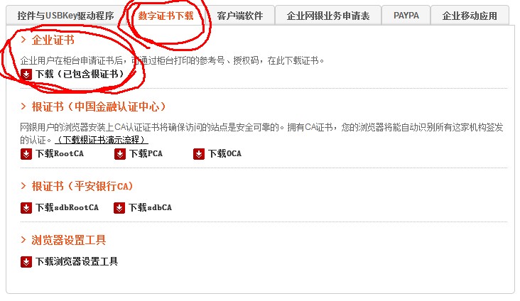 你應(yīng)該也打開(kāi)過(guò)這個(gè)頁(yè)面,要不你就不會(huì)看到有USBKey驅(qū)動(dòng)程序下載,右則還有幾個(gè)選項(xiàng)的,第一項(xiàng)也就是默認(rèn)項(xiàng)就是“控件與USBKey驅(qū)動(dòng)程序”,你點(diǎn)旁邊的“數(shù)字證書(shū)下載”選項(xiàng),就看到有企業(yè)證書(shū)下載了??聪聢D紅色圈圈。