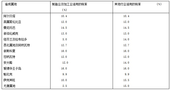 注:所有省和屬地對(duì)加拿大控股的小型私人公司的勤勞經(jīng)營所得中不超過30萬加元(2006年以后為40萬加元,在有些省,此限額高于30萬加元)的部分,都按照2.5%至8.1%的低稅率征稅。