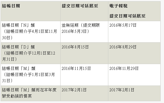 - 如結(jié)賬日期「M」類(結(jié)賬日期1月1日至3月31日) 提交日期可延展至2023年11月15日,如使用電子報稅提交日期可延展至2023年11月29日。