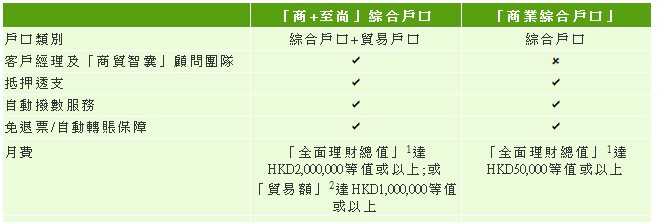 “商業(yè)綜合戶口”的服務(wù)月費(fèi)是 HK$180,賬戶存款余額達(dá)5萬及以上就免收月費(fèi);“商+至尚”綜合戶口的服務(wù)月費(fèi)是HK$600,賬戶存款余額達(dá)200萬及以上就免收月費(fèi);
