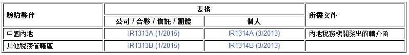 - IR1313A (1/2015) – 涉及與中國(guó)內(nèi)地簽訂的全面性避免雙重課稅安排
