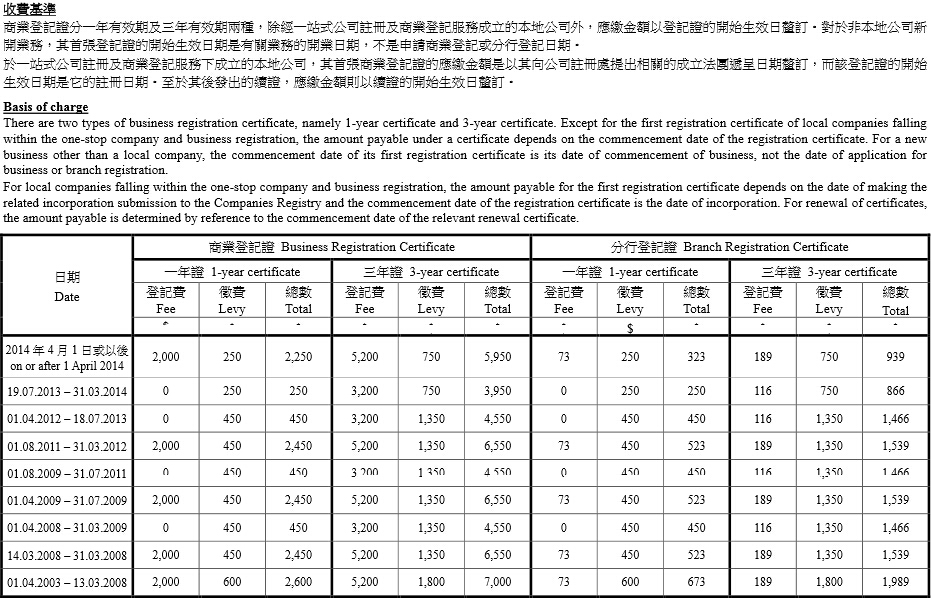 香港商業(yè)登記證現(xiàn)時收費表及2003年至今價格記錄: