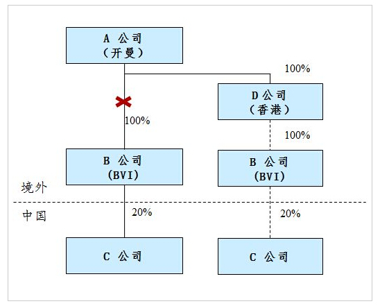 然而,如下圖所示,假設(shè)A公司為開曼公司,而D公司為香港公司,由于(1)開曼和中國之間沒有避免雙重征稅的稅收協(xié)定;而(2)香港和中國內(nèi)地的稅收安排規(guī)定,如果香港公司持有中國公司(主要資產(chǎn)為非房地產(chǎn))股權(quán)比例低于25%,則股權(quán)轉(zhuǎn)讓不在中國征稅。因此,如果未來D公司再次將B公司股權(quán)轉(zhuǎn)讓時,如果其持股比例低于25%,則中國的征稅權(quán)會由此受到限制,從而與A公司轉(zhuǎn)讓B公司股權(quán)相比,會導(dǎo)致中國所得稅負擔(dān)減少。在這種情況下,則不符合本條的規(guī)定。