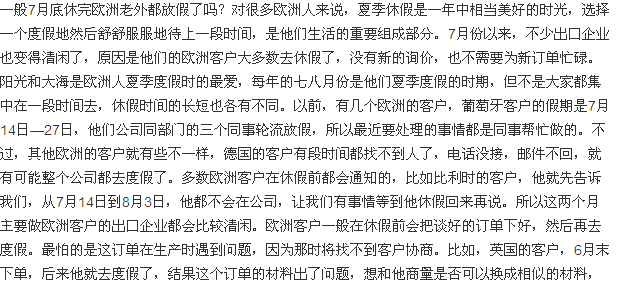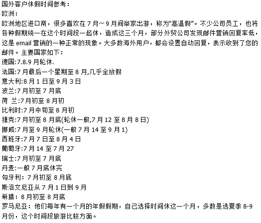 歐洲地區(qū)進口商,很多喜歡在7月~9月間舉家出游,稱為“高溫假”。不少公司員工,也將各種假期統(tǒng)一在這個時間段一起休,造成這三個月,部分外貿(mào)公司發(fā)現(xiàn)郵件營銷回復(fù)率低,這是email營銷的一種正常的現(xiàn)象。大多數(shù)海外用戶,都會設(shè)置自動回復(fù),表示收到了您的郵件。主要國家如下: