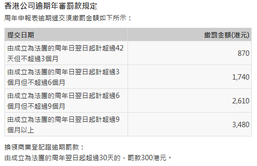 - 如在成立為法團(tuán)的周年日翌日起計(jì)超過(guò)42天但不超過(guò)3個(gè)月 HK$870