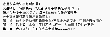 關(guān)于交通銀行離岸賬戶手續(xù)費(fèi)這要看你是發(fā)生了什么業(yè)務(wù),如是網(wǎng)銀轉(zhuǎn)賬那須10美元/筆,匯款單20美元,如果日均少于1000美元,年費(fèi)150美元。如果還有不明白,可以咨詢開戶行客戶經(jīng)理。答
