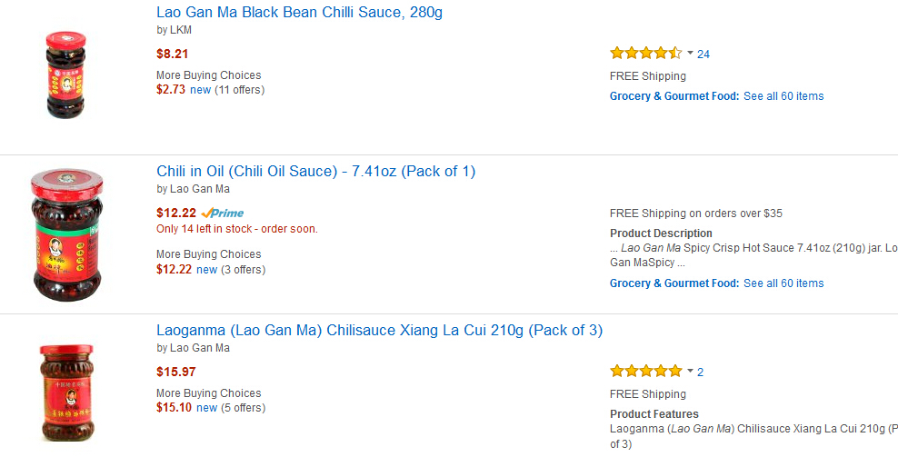特意上美亞看下,還真是,不過也有8美金左右的。給好評五星量嚇到了,老干媽真是大眾口味啊。