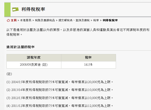 2015/2016年度香港有限公司利得稅稅率為16.5%,無限公司為15%。答