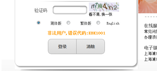 登錄時(shí)提示“非法用戶,錯(cuò)誤代碼:EBK1001” 解決方法:“非法用戶”是由于客戶輸入的企業(yè)客戶號或用戶登錄名不匹配造成的,請核對后重新登入。答
