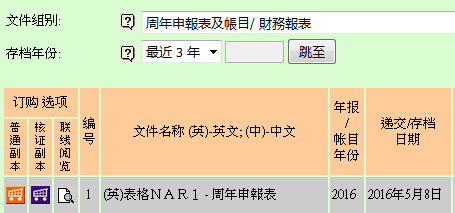 香港公司現況為仍注冊,說明公司正常注冊,看不出當年有沒有年審。 怎么判斷香港公司有沒有正常年審,你要進一步點進入文件索引,看列表中有沒有當年的表格NAR1-周年申報表。 答