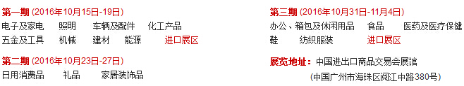 2017年第121屆廣交會 第一期 2017年4月15日-19日 第二期 2017年4月23日-27日 第三期 2017年5月1日-5日 展覽地址: 中國進出口商品交易會展館 (中國廣州市海珠區(qū)閱江中路380號)答