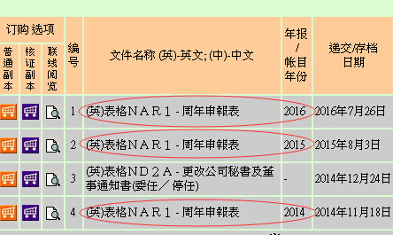 進(jìn)去選[查閱文件索引],可以選[公司編號(hào)]、[公司英文全名]或[公司中文全名],中文要繁體字,這樣進(jìn)去就可以查詢到香港公司基本資料了,要查更多信息,點(diǎn)下面的[進(jìn)入文件索引],選擇相應(yīng)的存檔年份,再點(diǎn)[跳至],進(jìn)入這里,你香港公司有沒(méi)有年審就可以看里面出來(lái)了,如今天遞交的年審,會(huì)顯示最新的 表格 NAR1 周年申報(bào)表,遞交/存檔日期:2016年9月5日。如今年已經(jīng)到期年審,但缺少今年的記錄,說(shuō)明不正常了。 以上內(nèi)容參考 by @qixing