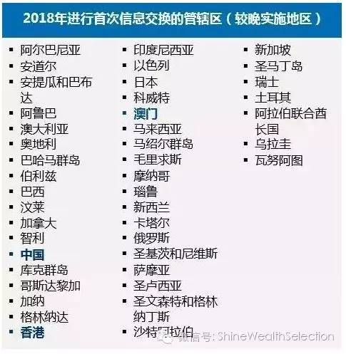 CRS是仿制FATCA而創(chuàng)建的,但其報(bào)告的數(shù)據(jù)要求不同,報(bào)告的信息量更大。截至2015年12月11日,已經(jīng)有97個(gè)國家和地區(qū)承諾執(zhí)行多邊自動(dòng)情報(bào)交換,2017年9月,中國個(gè)人及其控制的公司在下列56個(gè)國家和地區(qū)開設(shè)的銀行賬戶信息(截至到2016年底的信息)將會(huì)主動(dòng)呈報(bào)于中國稅務(wù)機(jī)關(guān),其中包含眾多投資者熟悉的國家和地區(qū):BVI、開曼群島、百慕大、塞舌爾、盧森堡、英國、法國、德國等等一些重要的離岸金融中心,已經(jīng)公開同意執(zhí)行自動(dòng)信息交換。不同國家處于不同的CRS實(shí)施階段,56個(gè)國家/地區(qū)將在2017年9月1日開始首次信息交換,41個(gè)包括中國和香港將在2018年9月1日年開始。
