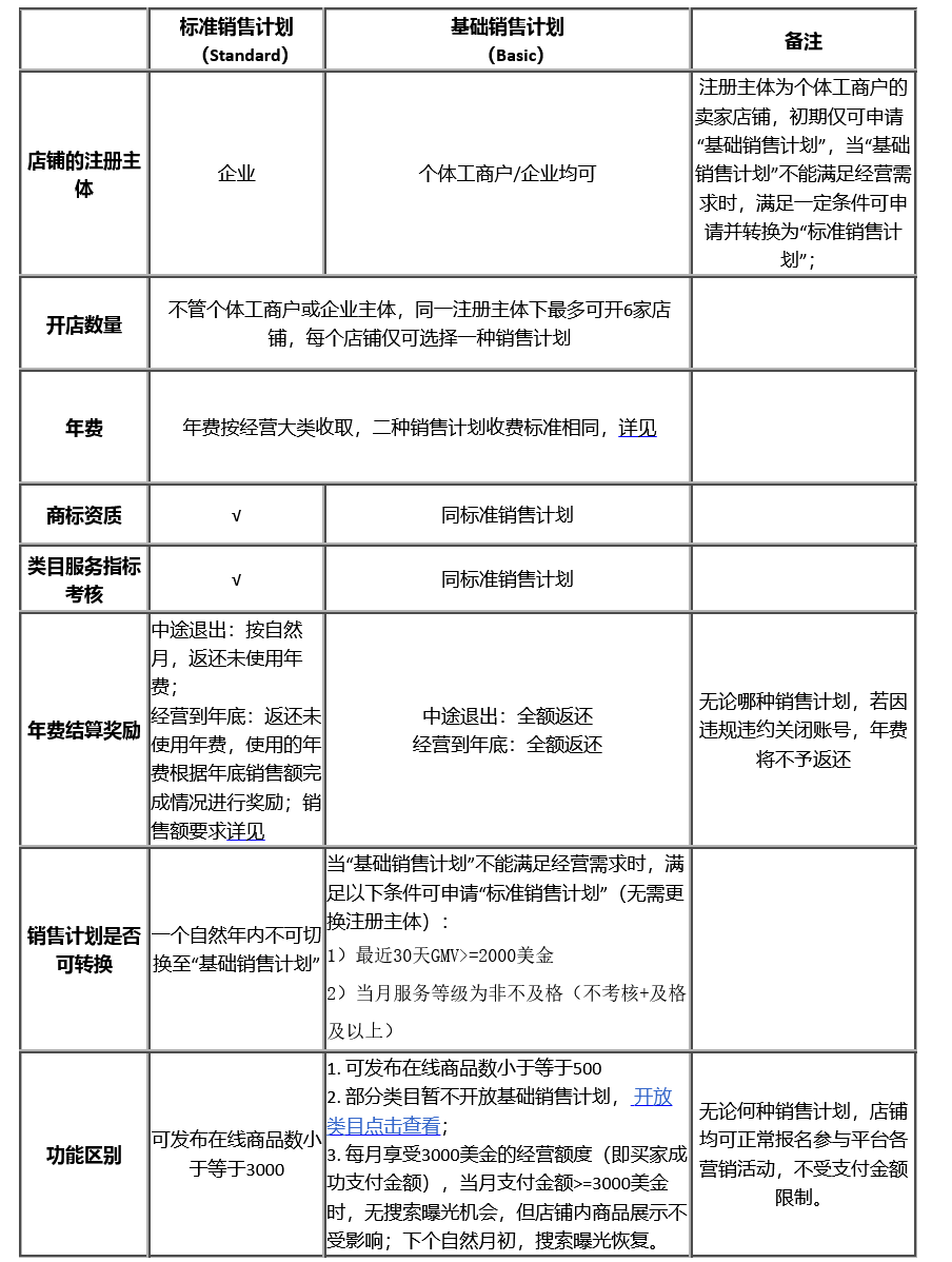 1、速賣通有兩種銷售計(jì)劃類型:標(biāo)準(zhǔn)銷售計(jì)劃和基礎(chǔ)銷售計(jì)劃供商家選擇,一個(gè)店鋪只能選擇一種銷售計(jì)劃類型。標(biāo)準(zhǔn)銷售計(jì)劃和基礎(chǔ)銷售計(jì)劃的區(qū)別,詳見下表。除此之外,標(biāo)準(zhǔn)銷售計(jì)劃和基礎(chǔ)銷售計(jì)劃無(wú)其他區(qū)別: