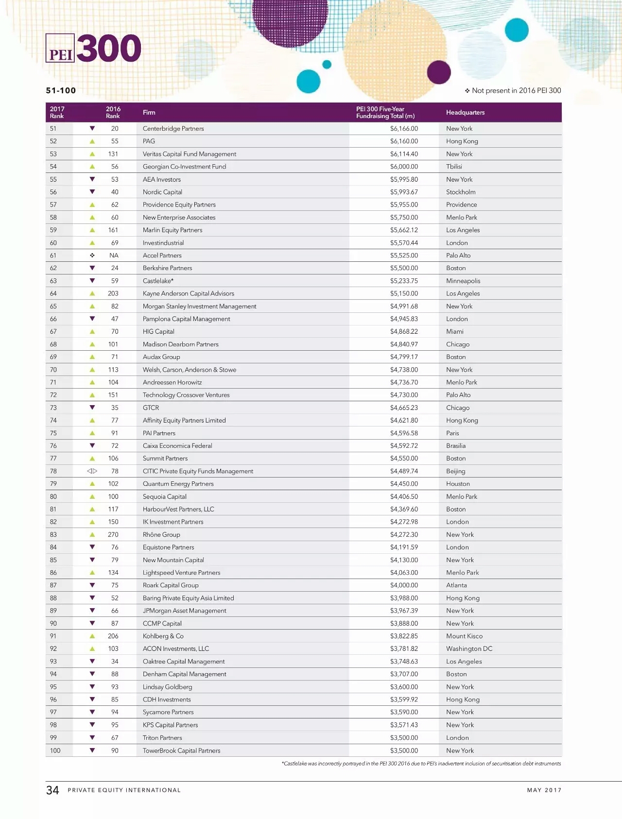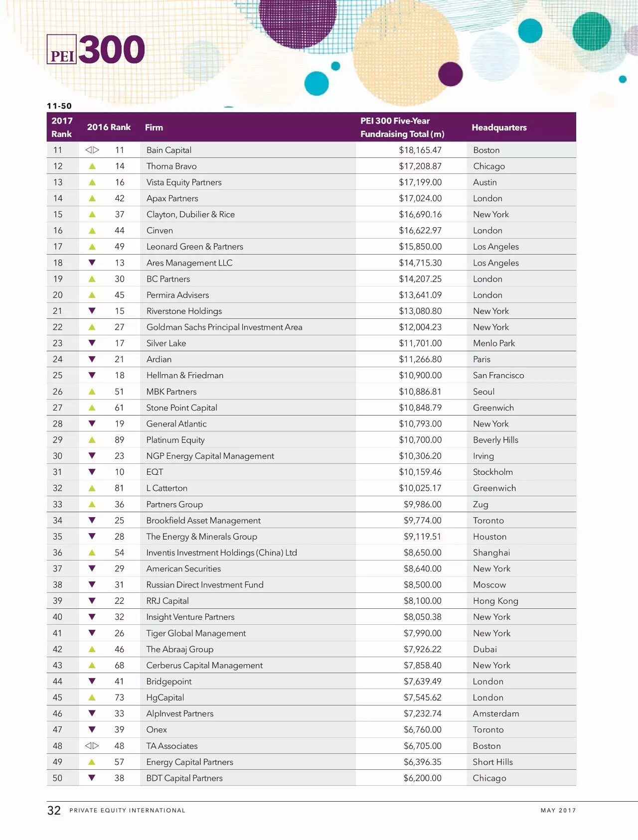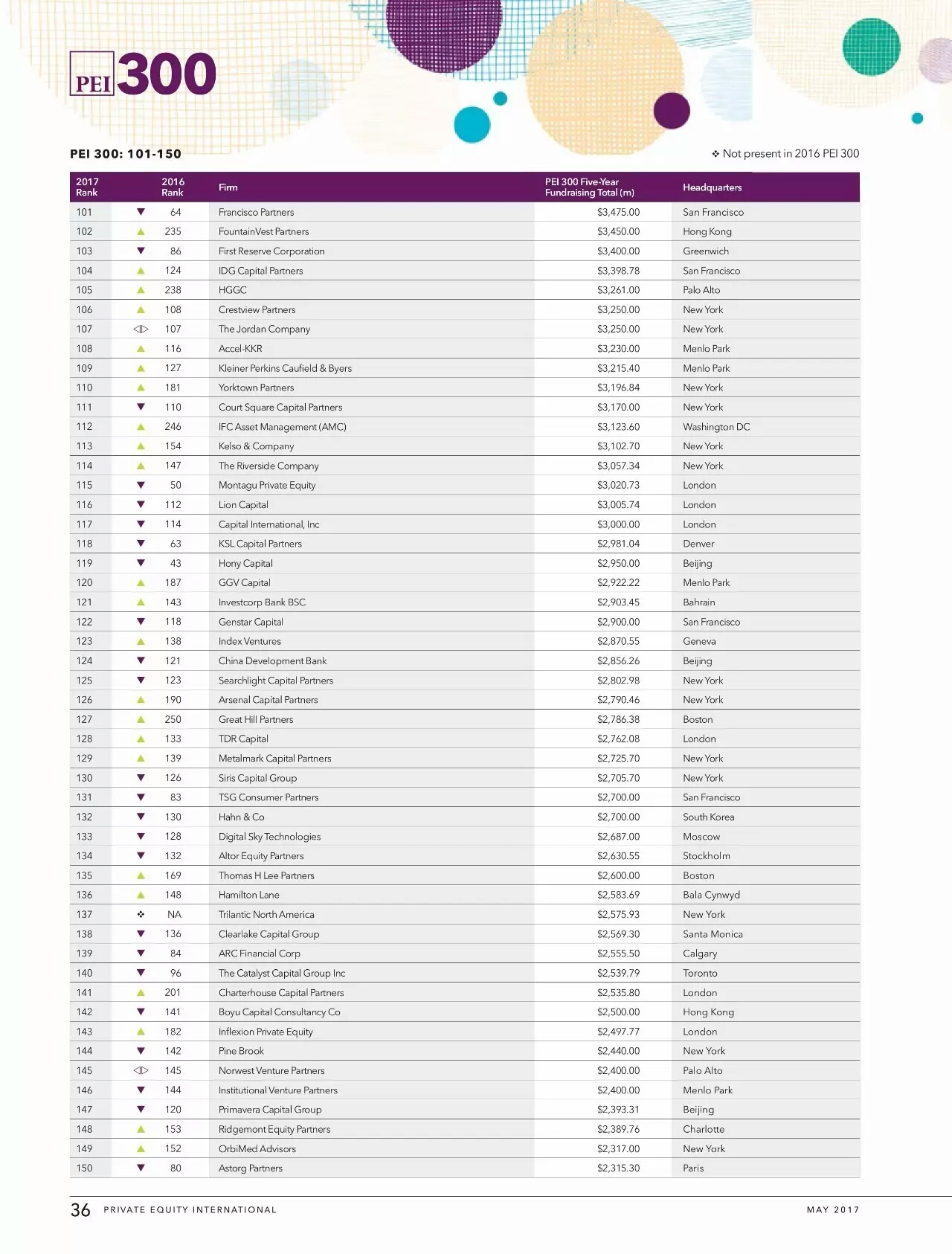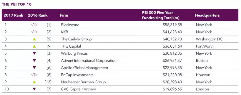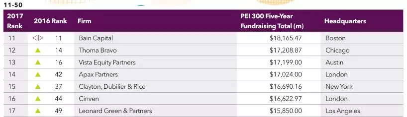 5月7日,倫敦最具權(quán)威的全球另類資產(chǎn)投資(私募股權(quán),債權(quán)投資,房地產(chǎn),etc.) 排名媒體Private Equity International發(fā)布了2016年最新的全球私募股權(quán)機構(gòu)排名。按照過去五年的融資額進行排名,在各個機構(gòu)IRR并不透明的今天,融資額作為一個代表專業(yè)市場認可度的指標,以五年為限,具有相當?shù)墓哦取?這里主要提及在中國有業(yè)務(wù)的外資PE以及部分國內(nèi)本土的主流玩家,先看前十七名(將在大陸比較活躍的Silverlake包括進來)。