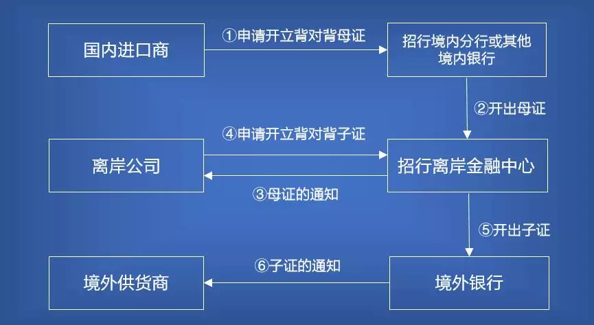 4. 離岸公司向招行離岸金融中心申請開立以境外供貨商為受益人的信用證,即“背對背子證”。